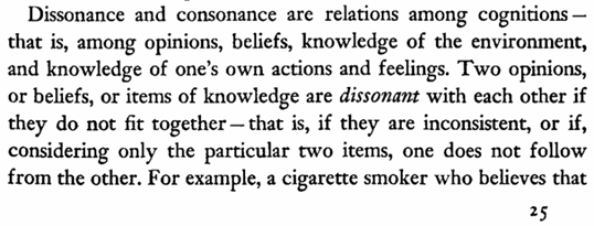 “Dissonans och konsonans är relationer mellan kognitioner som är, bland åsikter, övertygelser, kunskap om omgivningen och kunskap om ens egna handlingar och känslor. Två åsikter, eller övertygelser, eller objekt av kunskaper är dissonanta med varandra om de inte passar ihop, det vill säga om de är inkonsekventa, eller om det ena inte följer av det andra, bara med tanke på de två specifika punkterna. Till exempel har en cigarettrökare som tror att rökning är dåligt för hans hälsa en åsikt som är dissonant med vetskapen om att han fortsätter att röka. Han kan ha många andra åsikter, övertygelser eller kunskapsobjekt som är konsonanta med att fortsätta röka men dissonansen finns inte desto mindre också.