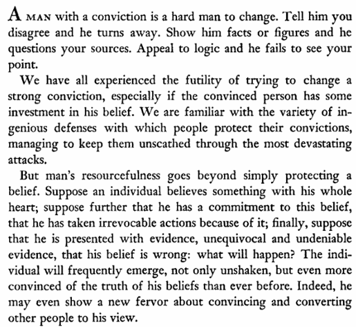 “Men människans fyndighet går längre än att bara skydda en övertygelse. Anta att en individ tror på något av hela sitt hjärta; anta vidare att han har ett åtagande för denna tro, att han har vidtagit oåterkalleliga handlingar på grund av den; anta slutligen att han ställs inför bevis, otvetydiga och obestridliga bevis, att hans tro är fel: vad kommer att hända? Individen kommer ofta att framgå, inte bara orubblig, utan ännu mer övertygad om sanningen i sin tro än någonsin tidigare. I själva verket kan han till och med visa en ny glöd när det gäller att övertyga och omvända andra människor till hans åsikt.” [3] (Utdraget är direktöversatt)