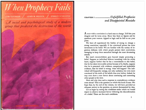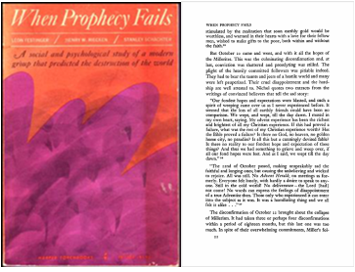 Boken When Prophecy Fails fokuserar på profetiornas misslyckande att gå i uppfyllelse, kallat vederläggande av Festinger, och den åtföljande förnyelsen av energi och tro på deras källa till gudomlig vägledning. Hans teori förutsätter att sekten har vissa identifierande drag, såsom: (a) tro som hålls med djup övertygelse tillsammans med respektive åtgärder som vidtagits, (b) övertygelsen eller förutsägelsen måste vara tillräckligt specifik för att kunna vederläggas (dvs. den hände inte), (c) den troende är medlem av en grupp likasinnade troende som stödjer varandra och till och med konverterar/omvänder. Alla dessa egenskaper fanns i UFO-sekten.