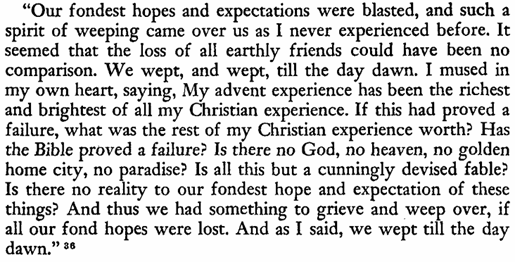 “Våra djupaste förhoppningar och förväntningar förintades, och en sådan gråtanda kom över oss som jag aldrig tidigare upplevt. Det verkade som att förlusten av alla jordiska vänner inte kunde ha varit någon jämförelse. Vi grät och grät tills dagen grydde. Jag funderade i mitt eget hjärta och sa att min adventsupplevelse har varit den rikaste och ljusaste av alla mina kristna upplevelser. Om detta hade visat sig vara ett misslyckande, vad var resten av min kristna upplevelse värd? Har Bibeln visat sig vara ett misslyckande? Finns det ingen Gud, ingen himmel, ingen gyllene hemstad, inget paradis? Är allt detta bara en listigt uttänkt fabel? Finns det ingen verklighet för vårt djupaste hopp och förväntningar på dessa saker? Och därmed hade vi något att sörja och gråta över, om alla våra kära förhoppningar gick förlorade. Och som jag sa, vi grät tills dagen grydde.” [6] (Utdraget är direktöversatt)