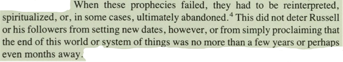 “Ingen större kristen sekteristisk rörelse har varit så insisterande på att profetera slutet av den nuvarande världen på så bestämda sätt eller på sådana specifika tidpunkter som Jehovas vittnen har gjort, åtminstone sedan milleriterna och adventisterna på 1800-talet som var vittnenas direkta tusenårsläroförfäder. Under de första åren av deras historia tittade de konsekvent på specifika tidpunkter – 1874, 1878. 1881, 1910, 1914, 1918, 1920, 1925 och andra – som har en bestämd eskatologisk betydelse… När dessa profetior misslyckades, var de tvungna att omtolkas, förandligas, eller i vissa fall till slut överges. Detta avskräckte inte Russell eller hans anhängare från att ställa in sig på nya tidpunkter, emellertid, eller från att helt enkelt proklamera att slutet på denna värld eller tingens ordning inte var mer än några år eller kanske månader bort.” [8] (Utdraget är direktöversatt)