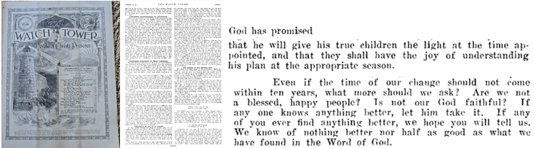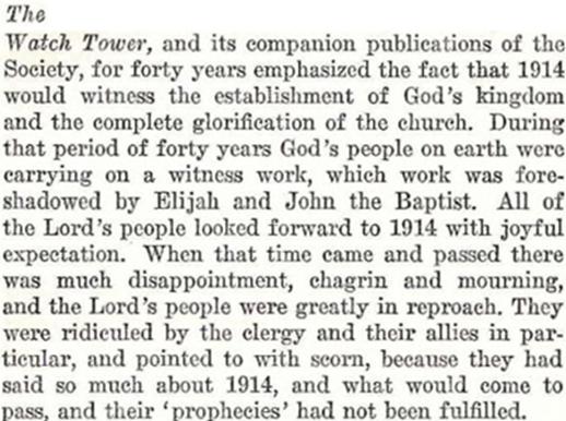 “Vakttornet och dess medföljande publikationer från Sällskapet, under fyrtio år betonade det faktum att 1914 skulle bevittna upprättandet av Guds rike och det fullständiga förhärligandet av kyrkan. Under den fyrtioårsperioden bedrev Guds folk på jorden en vittnesarbete, vars arbete förebådades av Elia och Johannes Döparen. Allt Herrens folk såg fram emot 1914 med glädje.