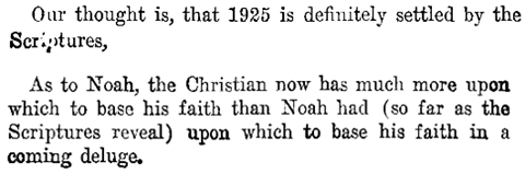 “Vår tanke är att 1925 definitivt är fastställt av skrifterna. När det gäller Noa har den kristne nu mycket mer att grunda sin tro på än Noa hade att basera sin tro på i en kommande syndaflod.” [14]