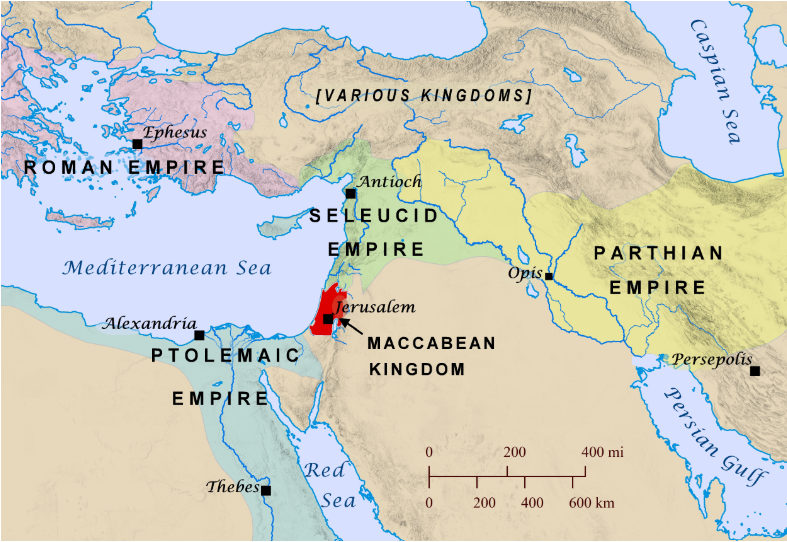 Följande karta visar hur förhållandet mellan de seleukidiska och ptolemaiska riken geografiskt sett var norr och söder om Israel.