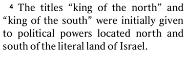 ”Från början syftade uttrycken nordens kung och söderns kung på politiska makter som låg norr och söder om landet Israel.” – Vakttornet, Studieupplagan, maj 2020, sid. 3 (sve. & eng.)