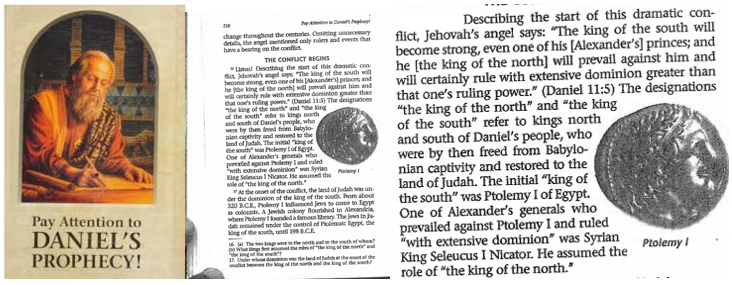 ”Jehovas ängel beskriver hur den dramatiska konflikten börjar: ”Söderns kung skall bli stark, ja en av hans [Alexanders] furstar; och han [Nordens kung] skall få övertaget över honom och härska med stor makt, större än dennes härskarmakt.” (Daniel 11:5) Beteckningarna ”Nordens kung” och ”Söderns kung” syftar på kungar norr och söder om Daniels folk, som vid det här laget hade befriats från fångenskapen i Babylon och återvänt till Judas land. Den förste ”Söderns kung” var Ptolemaios I av Egypten. En av Alexanders generaler som fick övertaget över Ptolemaios I och som härskade ”med stor makt” var den syriske kungen Seleukos I Nikator. Han iklädde sig rollen som ”Nordens kung”.” – Ge akt på Daniels profetia [1999], sid. 218 (sve. & eng.)