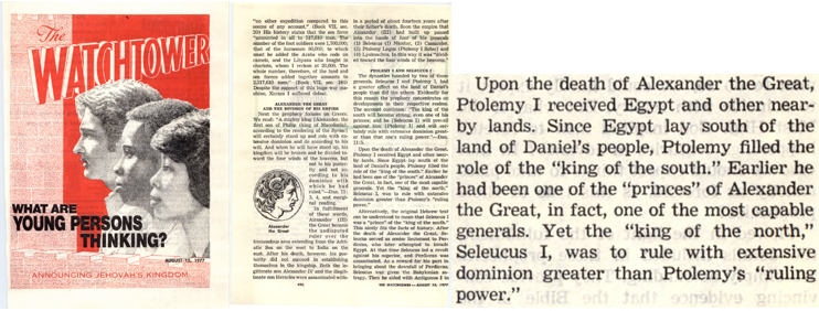 “Efter Alexander den stores död fick Ptolemaios I Egypten och andra närliggande länder. Eftersom Egypten låg söder om Daniels folks land, fyllde Ptolemaios rollen som “Söderns kung”. Tidigare hade han varit en av Alexander den stores “furstar”, ja, en av de mest skickliga generalerna. Ändå skulle “Nordens kung”, Seleukos I, regera med ett omfattande herravälde, större än Ptolemaios “styrande makt”.” – Vakttornet, 15 augusti 1977, sid. 490 (eng.) (Utdraget är direktöversatt)