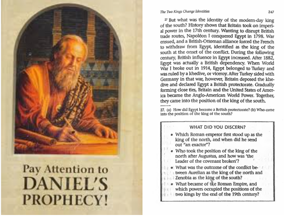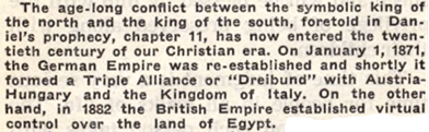 ”I redogörelsen för den uråldriga maktkamp mellan de symboliska konungarna ”Nordlandskonungen” och ”Söderlandskonungen”, som blivit förutsagd i Daniels profetia, kapitel 11, har vi nu nått fram till 1900-talet av vår kristna era. Den 1 januari 1871 återupprättades Tyska riket, och inom kort ingick det en trippelallians med Österrike-Ungern och kungariket Italien. Å andra sidan satte sig Brittiska imperiet år 1882 i besittning av herraväldet över Egypten.” – Vakttornet, 15 april 1960, sid. 185 (sve.) – Vakttornet, 15 januari 1960, sid. 56 (eng.)