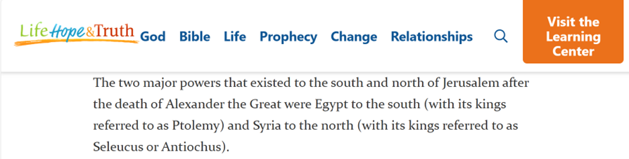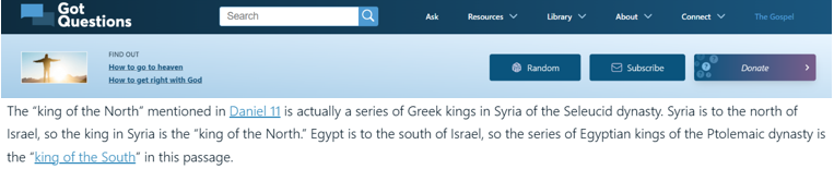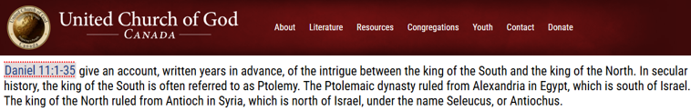 ”Daniel 11:1–35 ger en redogörelse, skriven år i förväg, för intrigen mellan kungen i Södern och kungen i Norr. I den sekulära historien kallas kungen i Södern ofta för Ptolemaios. Den ptolemaiska dynastin regerade från Alexandria i Egypten, som ligger söder om Israel. Kungen i Norr regerade från Antiokia i Syrien, som ligger norr om Israel, under namnet Seleukos eller Antiochos.” – https://www.ucg.ca/booklets/the-final-superpower/king-north-vs-king-south (sedan augusti 2025)