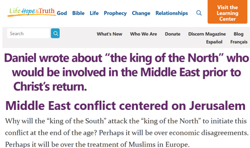 “Daniel skrev om ”Nordens kung” som skulle vara involverad i Mellanöstern före Kristi återkomst. … Konflikten i Mellanöstern kretsade kring Jerusalem. Varför kommer ”Söderns kung” att attackera ”Nordens kung” för att initiera denna konflikt vid tidsålderns slut? Kanske kommer det att handla om ekonomiska meningsskiljaktigheter. Kanske kommer det att handla om behandlingen av muslimer i Europa.” – https://lifehopeandtruth.com/prophecy/understanding-the-book-of-daniel/the-king-of-the-north/ (från och med augusti 2025)