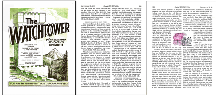 ”Det skulle vara ett stort misstag att mena, att alla de profetiska bilder som Gud lät uppteckna i de heliga hebreiska skrifterna fick sin uppfyllelse i Kristi och apostlarnas dagar. Tvärtom bör man betrakta dessa uppfyllda profetiska bilder såsom påtagliga bevis för att andra profetiska bilder, som förutsäger händelser i våra dagar, likaså skall komma att gå i uppfyllelse.” – Vakttornet, 15 maj 1951, sid. 235 (sve.) – Vakttornet, 15 september 1950, sid. 323–324 (eng.)