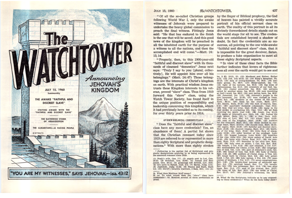 Har den ”trogne och omdömesgille slaven” ytterligare legitimation att förete? Ja, en stor myckenhet! En lista, som alls inte är fullständig, visar att den kristna kvarlevan, sådan den existerar i vår tid sedan 1919, finns omtalad eller framställd genom mer än åttio bibliska och profetiska beteckningar och bilder. Med mer än åttio penseldrag av den bibliska profetians finger har himmelens Gud målat ett levande och exakt porträtt av sin officiella tjänareklass på jorden. Den verklighet som detta porträtt återger framstår nu, med alla sina av Gud förutbestämda drag, på världsscenen så att alla kan se den. Det är en legitimation, som inte ens skuggan av ett tvivel vilar på. I själva verket är legitimationsbevisen så talrika, de pekar så samstämmigt på den enda klarvakna klassen, den ”trogne och omdömesgille slaven”, att det är omöjligt för den store bedragaren, Satan, att frambringa en falsk organisation som kan uppvisa alla dessa av Skriften angivna åttio drag och kännetecken. …” – Vakttornet, 15 november 1960, sid. 516–517 (sve.) – Vakttornet, 15 juli 1960, sid. 437 (eng.)