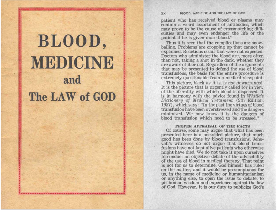 ”Jehovas vittnen argumenterar inte att blodtransfusioner inte har hållit patienter vid liv som annars skulle ha dött.” – Blodet, läkekonsten och Guds lag [1953], sid. 38 (eng.) (Ingen svensk utgåva av broschyren hittades, utdraget är efter bästa förmåga direktöversatt)