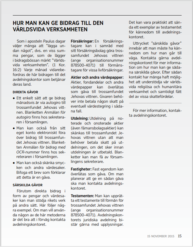 “När vi ser framöver behovet av att byta ut äldre fordon under det kommande året, skriver vi återigen för att bjuda in dig att bidra till detta arrangemang. Vi räknar med att kostnaderna kan täckas om det finns ett bidrag från varje församling på ett belopp av £3,00 (3,75 €) per förkunnare. Detta betyder inte att varje förkunnare förväntas bidra med detta belopp. Istället kan församlingen som helhet ge bidraget, och alla kan hjälpa till med kostnaden, när de är kapabla till det. (Apostlagärningarna 11: 29) Vi rekommenderar att varje församling antar ett beslut att bidra baserat på antalet förkunnare.” – Äldstebrev till alla församlingar i Storbritannien och Irland, 25 februari 2015 (Direktöversatt)
