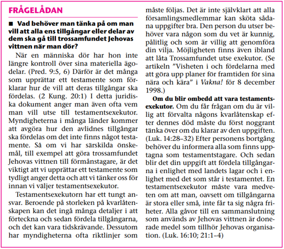 Detaljerade instruktioner förklarar hur man överför sina tillgångar till Watchtower vid döden.