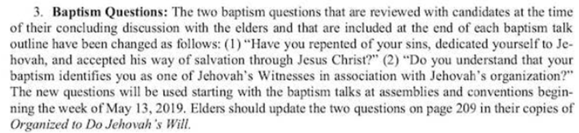 Dopfrågor: De två dopfrågorna som gås igenom med kandidaterna vid deras avslutande samtal med de äldste och som ingår i slutet av varje tal vid dop har ändrats enligt följande: ”(1) ”Har du ångrat dina synder, överlämnat dig åt Jehova och accepterat hans väg till frälsning genom Jesus Kristus?” (2) ”Förstår du att ditt dop identifierar dig som ett av Jehovas vittnen i förbindelse med Jehovas organisation?” De nya frågorna kommer att användas till att börja med i doptalen vid sammankomster och konvent med början veckan den 13 maj 2019. Äldste bör uppdatera de två frågorna på sidan 209 i sina exemplar av Organiserad för att göra Jehovas vilja.” – Meddelanden och Påminnelser, maj 2019 (Direktöversatt)