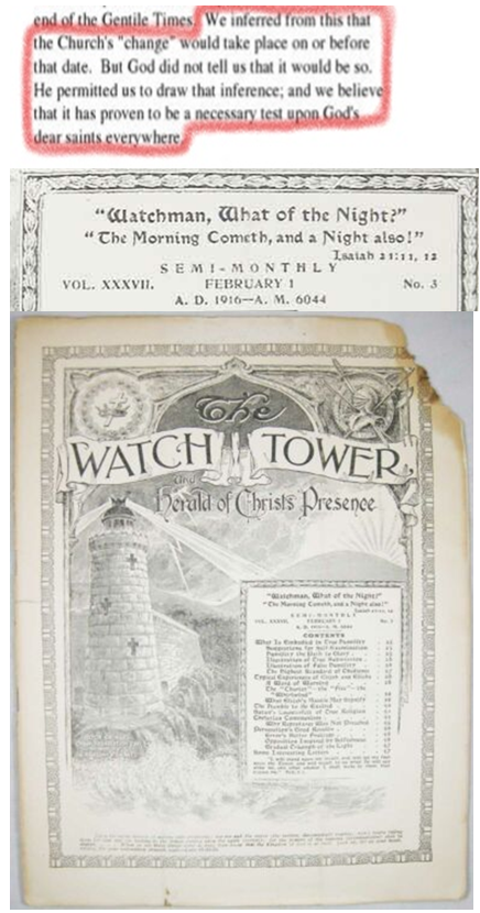 “Härstädes drogo vi slutsatsen att kyrkans ‘förvandling’’ skola äga rum vid eller före den tidpunkten. Men Gud upplyste icke för oss att det skulle bliva på det viset. Han lät oss draga den slutsatsen, och vi tror att det allestädes hava visat sig vara en nödvändig prövning för Guds avhållna helgon.” – Vakt Tornet, 1 februari, 1916, sidan 84 (eng.) (Hittade ingen svensk upplaga av artikeln, utdraget är efter bästa förmåga direktöversatt)
