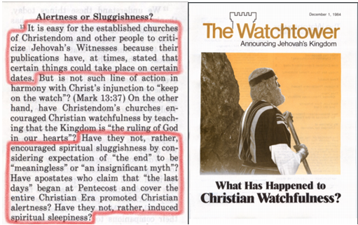 “Det är lätt för de etablerade kyrkorna i kristenheten och för andra människor att kritisera Jehovas vittnen på grund av att de i sina publikationer ibland har sagt att vissa ting skulle kunna inträffa vid någon viss bestämd tidpunkt. … Har de inte i stället uppmuntrat till andlig lättja genom att betrakta förväntan på ”slutet” eller ”änden” som någonting ”meningslöst” eller som ”en betydelselös myt”? Har de avfällingar som hävdar att ”de yttersta dagarna” började vid pingsten och omfattar hela den kristna eran främjat kristen vaksamhet? Har de inte snarare ingjutit en andlig sömnaktighet?” – Vakttornet, 1 december, 1984, sidan 18 (eng. & sve.)