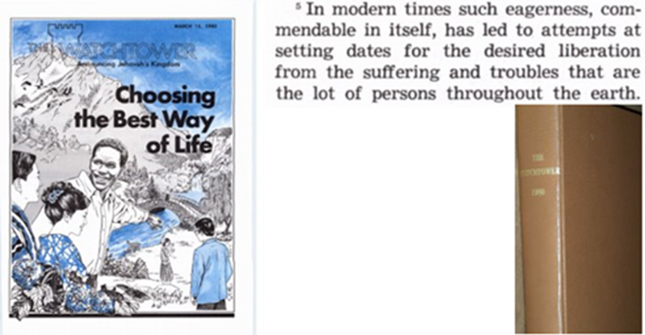 “På senare tid har sådan iver, som kan vara berömvärd i sig själv, lett till försök att fastställa datum för den efterlängtade befrielsen från det lidande och de svårigheter som är människors lott jorden utöver.” – Vakttornet, 15 juli, 1980, sidan 9–10 i svenska upplagan – Vakttornet, 15 mars, 1980, sidan 17 i engelska upplagan