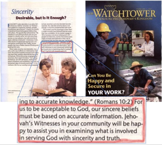 Vår uppriktiga tro måste grunda sig på tillförlitliga upplysningar för att vi skall vara godtagbara för Gud. Jehovas vittnen hjälper dig gärna att undersöka vad det innebär att tjäna Gud med uppriktighet och sanning.” – Vakttornet, 1 februari, 2003, sidan 32 (eng. & sve.)