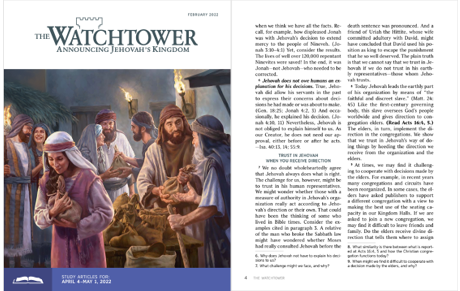 Jehova använder ”den trogne och förståndige tjänaren” för att leda den jordiska delen av sin organisation. … Vi visar att vi litar på Jehovas sätt att hantera saker när vi följer de anvisningar vi får från organisationen och de äldste.” – Vakttornet, Studieupplagan, februari 2022, sid. 4 (eng. & sve.)