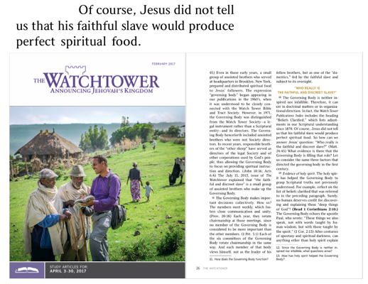 ”Jesus sa aldrig att hans trogne slav skulle ta fram fullkomlig andlig mat.” – Vakttornet, Studieupplagan, februari 2017, sid. 26 (eng. & sve.)