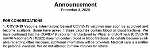 1. Information om COVID-19-vaccin: Flera Covid-19-vacciner kan snart bli godkända och tillgängliga. Vissa har frågat om dessa vacciner innehåller blod eller blodfraktioner. Vi har bekräftat att Covid-19-vaccinet som tillverkas av Pfizer och BioNTech (Covid-19 mRNA-vaccin BNT 162b2) inte innehåller blod eller blodfraktioner. Ytterligare information kommer att tillhandahållas allt eftersom information om andra vacciner blir tillgänglig. Medicinsk vård är en fråga för personligt beslut. Vi försöker inte göra val åt andra.” (Direktöversatt)