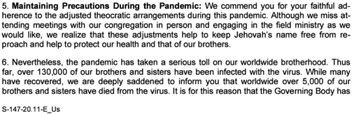 6. Trots detta har pandemin tagit hårt på vårt världsomspännande brödraskap. Hittills har över 130 000 av våra bröder och systrar smittats av viruset. Medan många har tillfrisknat är vi djupt ledsna att behöva meddela er att över 5 000 av våra bröder och systrar världen över har dött av viruset. Det är av denna anledning som den styrande kretsen har…” (Direktöversatt)