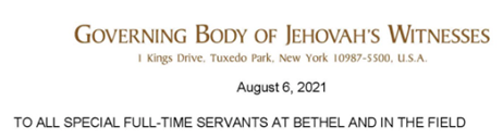 Ett konfidentiellt brev som skickades till alla speciella heltidstjänare på Betel och ute i fälttjänst den 6 augusti 2021 uppmuntrade starkt till användningen av vaccinationer.