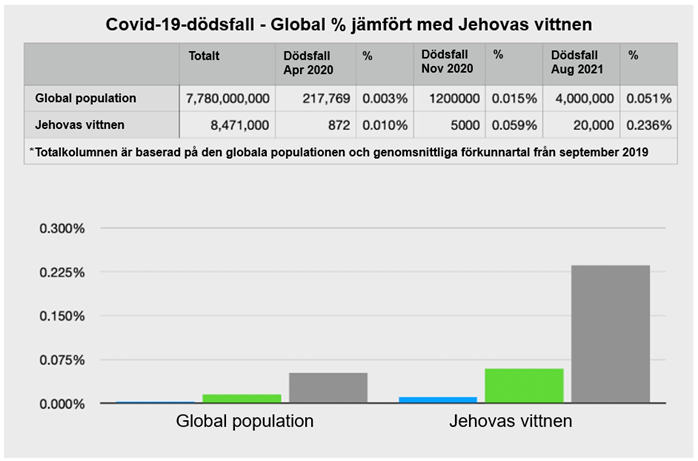Ett konfidentiellt brev adresserat till alla särskilda heltidstjänare på Betel och på fältet, daterat 6 augusti 2021, meddelade att nästan 20 000 Jehovas vittnen hade dött. Detta innebär att 0,236 % av Jehovas vittnen hade dött av covid-19, över fyra gånger högre än den globala siffran i augusti 2021 på 0,051 %. I december tillkännagav Rapport 10 från den styrande kretsen 2021 (https://www.jw.org/sv/nyheter/omr%C3%A5de/internationella/Rapport-10-fr%C3%A5n-den-styrande-kretsen-2021/) att 25 658 Jehovas vittnen hade dött på grund av covid-19.