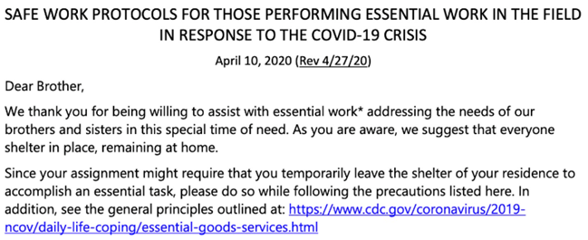 Vi tackar dig för att du är villig att hjälpa till med nödvändigt arbete* som tillgodoser våra bröders och systrars behov i denna särskilda tid av nöd. Som du är medveten om föreslår vi att alla håller sig hemma och stannar kvar på plats.