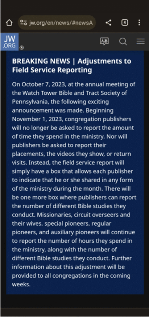 Vid årsmötet i oktober 2023 avskaffades kravet att rapportera timmar som man vittnade, så det kommer inte längre att vara möjligt att spåra den ökande ineffektiviteten i Sällskapet Vakttornets predikoform.
