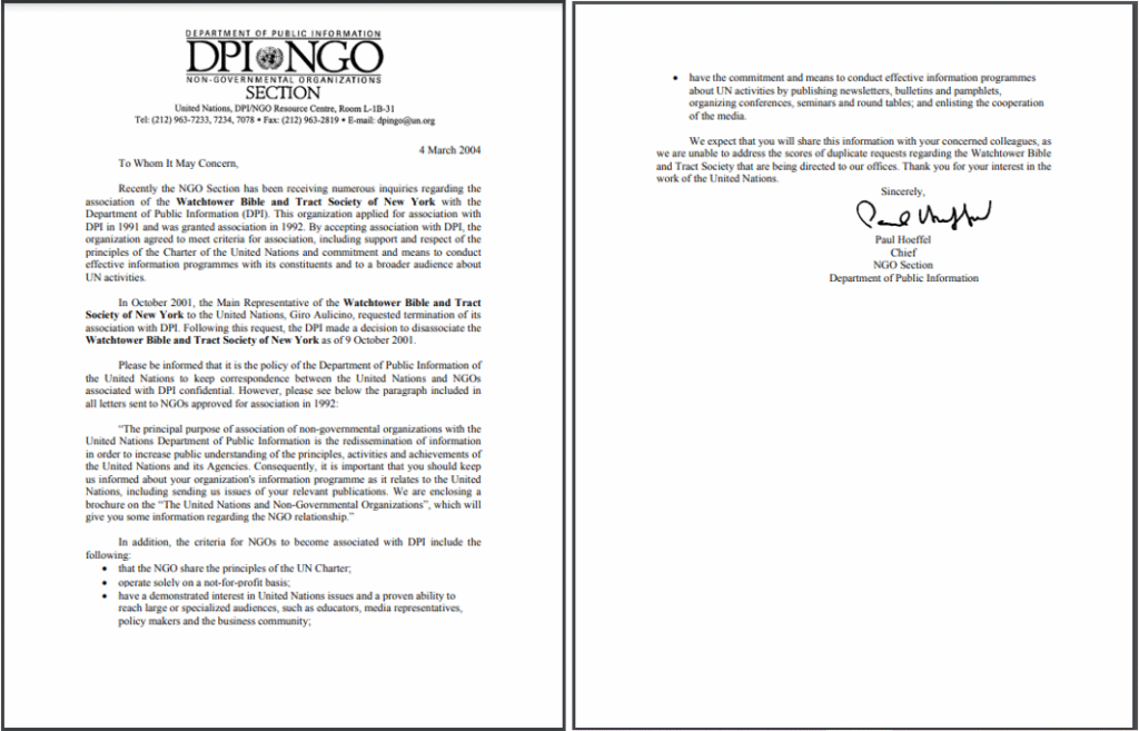 1. Vakttornets Bibel- och Traktatssällskap, INC, en icke-statlig organisation, hade varit ansluten till DPI sedan 1992 och begärde om att få upphäva dess anslutning år 2001, begäran beviljades den 9 oktober 2001. Enligt webbplatsen www.watchtower.org, är organisationen “en legal organisation som används av Jehovas vittnen”.
