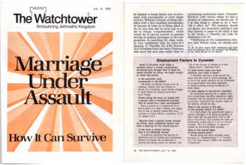 Även arbetet som fastighetsskötare eller receptionist vid en blodbank eller vid en fabrik, där man enbart tillverkar krigsmateriel, är ett arbete som står i direkt strid med Guds ord.” – Vakttornet, 15 november 1982, sid. 21 (sve.) – Vakttornet, 15 juli 1982, sid. 26 (eng.)