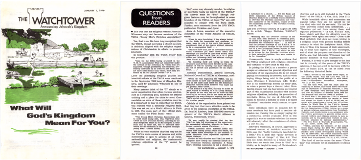 När en person blir medlem i KFUM, antar eller godkänner han organisationens allmänna målsättning och principer. … Medlemskapet betyder att man har blivit en integrerande del av denna organisation, som grundades med en bestämd religiös målsättning, bland annat för att verka för samgående mellan religionerna. Om ett av Jehovas vittnen blir medlem i en sådan så kallad ”kristen” förening, skulle det därför innebära detsamma som avfall.” – Vakttornet, 15 juli 1979, sid. 29, 30 (sve.) – Vakttornet, 1 januari 1979, sid. 30, 31 (eng.)