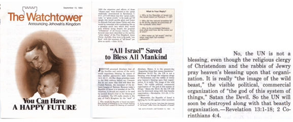 ”Nej, FN är inte en välsignelse, även om kristenhetens religiösa prästerskap och judendomens rabbiner ber om himmelens välsignelse över denna organisation. FN utgör verkligen ”vilddjurets bild”, den synliga politiska, kommersiella organisation som tillhör ”denna tingens ordnings gud”, Satan, djävulen. FN kommer således snart att tillintetgöras tillsammans med denna vilddjurslika organisation. — Uppenbarelseboken 13:1—18; 2 Korintierna 4:4.” – Vakttornet, 15 september 1984, sid. 15 (eng. & sve)