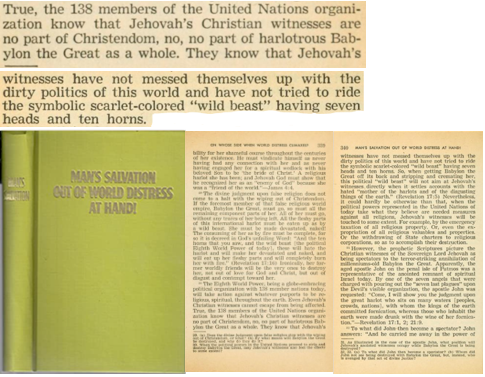 ”Förenta nationernas 144 (138 i engelska utgåvan) medlemmar vet visserligen att Jehovas kristna vittnen inte är någon del av kristenheten, nej, över huvud taget ingen del av det skökolika stora Babylon. De vet att Jehovas vittnen inte har blandat sig i denna världens smutsiga politik och inte försökt rida på det symboliska scharlakansröda ”vilddjuret”, som har sju huvuden och tio horn.” – Människans räddning ur världsnöden nära [1975/1976], sid. 339 (eng. & sve.)