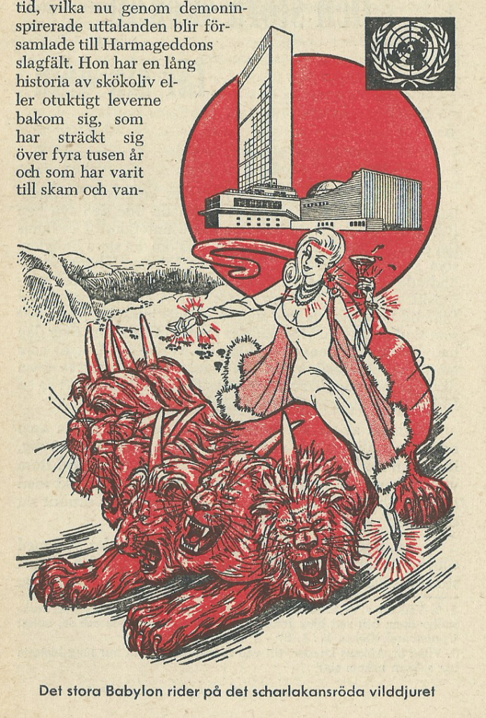 ”Förenta nationernas 144 (138 i engelska utgåvan) medlemmar vet visserligen att Jehovas kristna vittnen inte är någon del av kristenheten, nej, över huvud taget ingen del av det skökolika stora Babylon. De vet att Jehovas vittnen inte har blandat sig i denna världens smutsiga politik och inte försökt rida på det symboliska scharlakansröda ”vilddjuret”, som har sju huvuden och tio horn.” – Människans räddning ur världsnöden nära [1975/1976], sid. 339 (eng. & sve.)